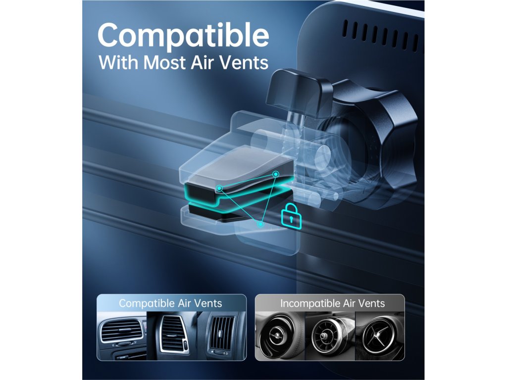 Pro maximální pevnost uchycení ve větrací mřížce je zobáček držáku vybaven aretačním šroubem. Po zasunutí držáku do větrací mřížky se dotáhne aretační šroub a držák je tak bezpečně uchycen.