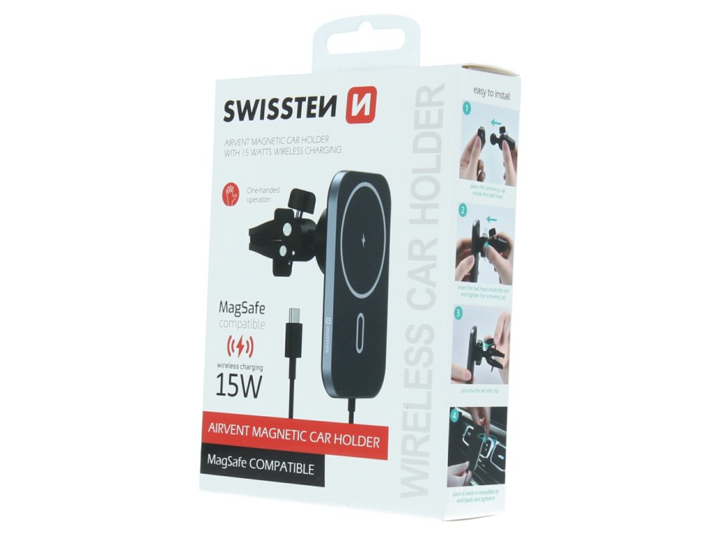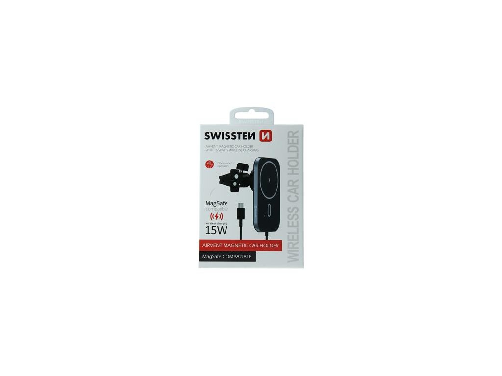 Magnetický držák Swissten do větrací mřížky s bezdrátovým dobíjením kompatibilním s MagSafe a vysokým výkonem 15W. Baleno v blistru SWISSTEN.