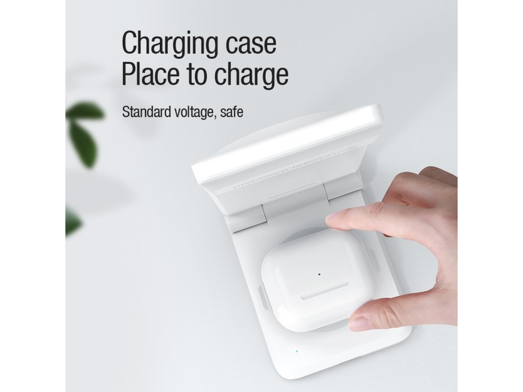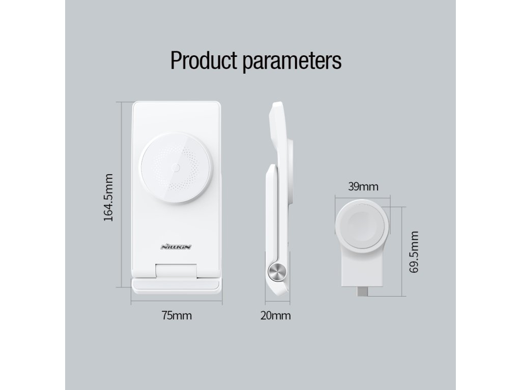 Nillkin PowerTrio bezdrátová nabíječka s MagSafe pro Váš telefon, bezdrátová sluchátka a chytré hodinky Apple Watch. Už Vás nebaví změť kabelů na stole, hledání který kabel je pro které zařízení? S tím je konec. Nillkin přináší nabíječku pro telefon, chytré hodinky a bezdrátová sluchátka. Jen jeden kabel a máte na stole pořádek, který Vám budou všichni závidět. Vše plně ovladatelné jen jednou rukou Pro telefon je zde jednoduchý stojánek, kam telefon jednou rukou postavíte. Nabíjení započne automaticky. Pro chytré hodinky je zde magnetický stojánek, který se právě díky magnetu postará o bezpečné a přesné uchycení hodinek. A v neposlední řadě bezdrátové nabíjení TWS sluchátek na základně za telefonem. Jen jeden kabel a telefon s hodinkami máte stále na očích. Stojánek je navržen tak, abyste měli svůj telefon i hodinky neustále na očích. To oceníte jak na pracovním stole, tak na nočním stolku nebo na poličce doma. Už Vám žádné upozornění ani hovor nemá šanci uniknout. Skladný, vhodný i na cesty Stojánek je možné složit a vzít ho s sebou kamkoliv. Na dovolenou, na jednání nebo ho snadně přenášet mezi pracovním stolem doma a v zaměstnání. Základnu pro nabíjení hodinek můžete navíc odpojit a použít ji samostatně jen pro hodinky. Je vybavena vstupem USB-C Vlastnosti - nabíjecí stojánek pro telefon s Magsafe, chytré hodinky Apple Watch a bezdrátová sluchátka - telefon lze nabíjet v horizontální poloze, ale i ve vertikální - skladný a snadno přenositelný - nabíjecí výkon 7,5W pro telefon - nabíjecí výkon 5W pro chytré hodinky - nabíjecí výkon 3W pro sluchátka - odnímatelná základna pro nabíjení hodinek s USB-C vstupem - ochrana proti položení cizích tělesDoplňkové parametry