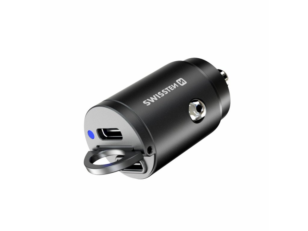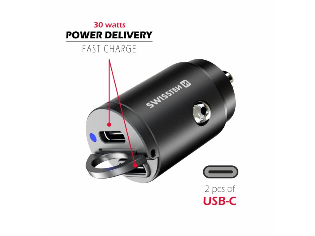 Nano autonabíječka SWISSTEN s výstupy 2x USB-C Power Delivery s celkovým výstupním výkonem 30W. Baleno v blistru SWISSTEN.