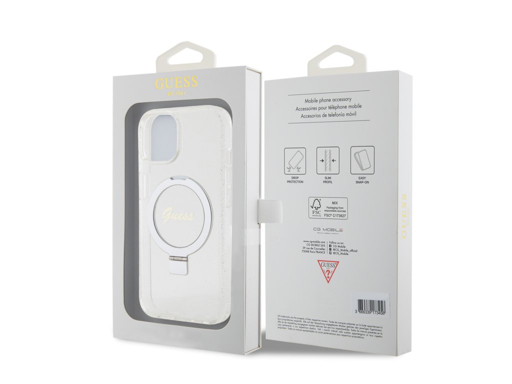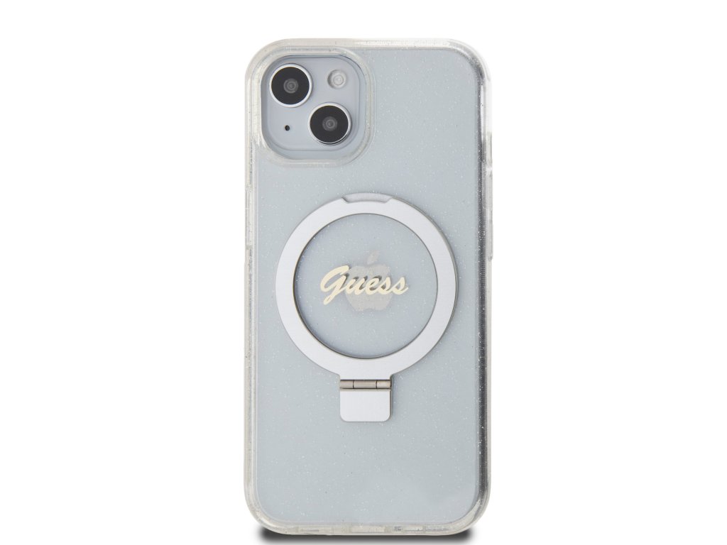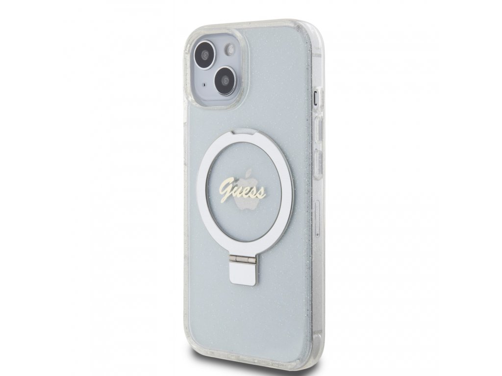 GUESS IML Ring Stand Glitter MagSafe Zadní Kryt pro iPhone 15 Transparent