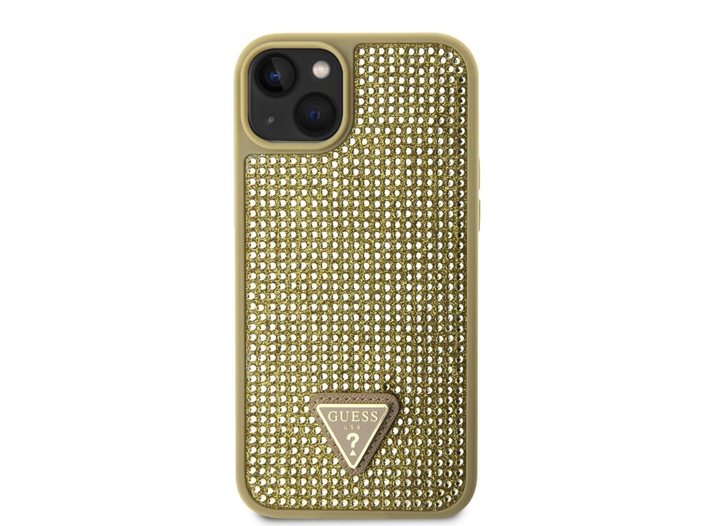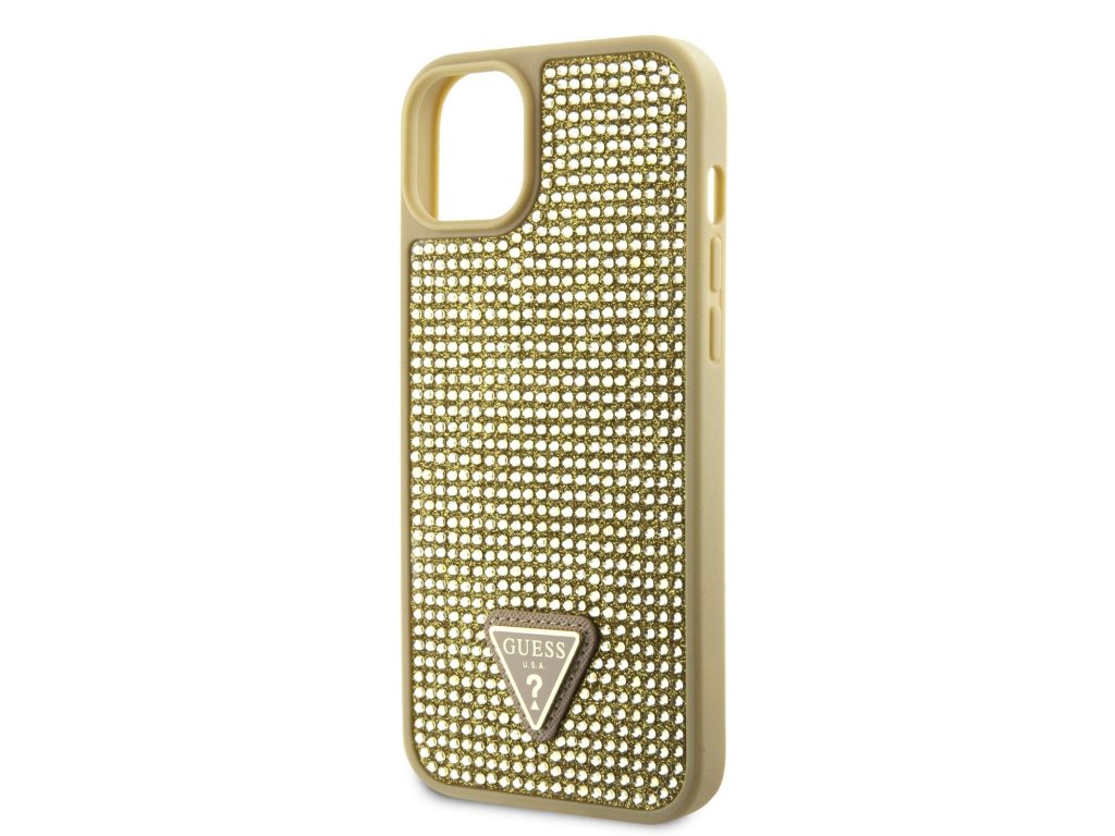 GUESS Rhinestones Triangle Metal Logo Kryt pro iPhone 15 Gold