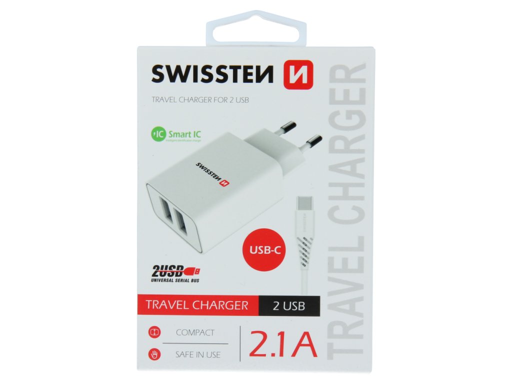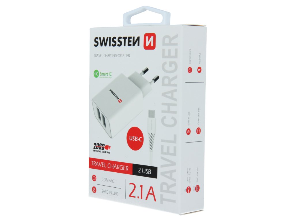 Kvalitní nabíječka s výstupním proudem 2,1A , technologií Smart IC a dvěma výstupy USB. V balení 1,2 m dlouhý USB-C kabel. Baleno v blistru SWISSTEN.