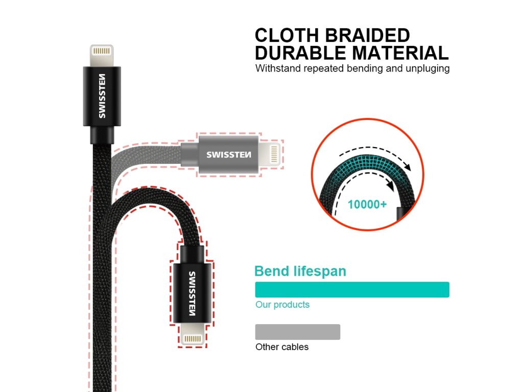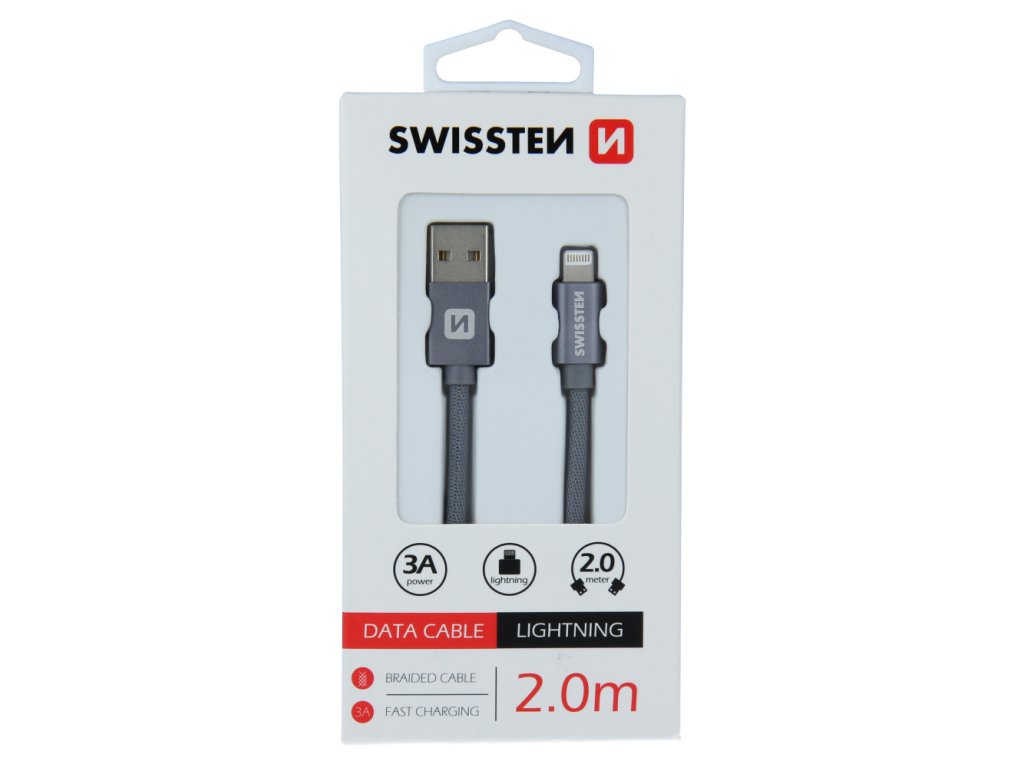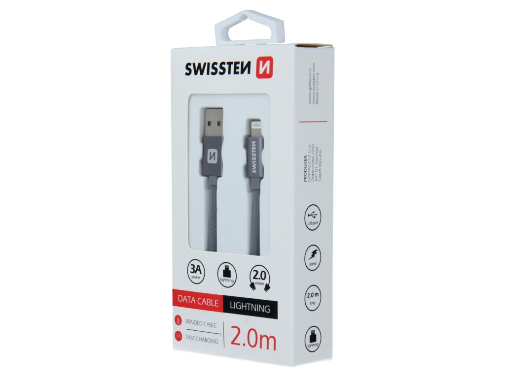 Datový kabel Swissten USB/Lightning s kvalitním textilním opletením a kovovými kryty konektorů. Díky délce 2,0m je vhodný do nákladních aut, do aut pro rodiny nebo pro lidi, kteří často dobíjejí a mají daleko zásuvku a v době dobíjení potřebují volat. Kabel je zesílený a přenese tak větší proud (až 3A) a zvládne i rychlý přenos dat 480 Mb/s. Životnost kabelu v ohybu je více než 10000 ohybů. Kovový kryt konektoru je odolnější proti mechanickému poškození než běžné plastové kryty konektorů. Technické parametry: Tloušťka kabelu - dva pocínované měděné vodiče, kde každý 22 AWG 70/0,01 (to znamená, že každý vodič má 70 pramenů tenkých 0,01 mm, (např originální kabel Apple MD818 má 37 pramenů o tloušce 0,08 mm) + vnější plášť TPE (měkký plast) - dva pocínované měděné datové prameny, kde každý 28 AWG-12 + vnější plášť TPE (měkký plast) Kryt konektoru - materiál: eloxovaný hliník Eloxování neboli anodizace je druh chemicko-tepelné povrchové úpravy výrobků z hliníku (zkratka ELektrolytická OXidace hliníku). Spočívá ve vytvoření ochranné vrstvy oxidu hliníku na upravovaném povrchu. Tato vrstva již dále neoxiduje, a tím před oxidací chrání i samotný hliník. Používá se například v letecké (i automobilové) výrobě ale nejčastěji v případech, kde je hliník použit v exteriéru, např. u hliníkových oken atd. Výhodou je, že po vytvoření tenoučké vrstvy je materiál chráněn proti povětrnostním vlivům.Doplňkové parametry