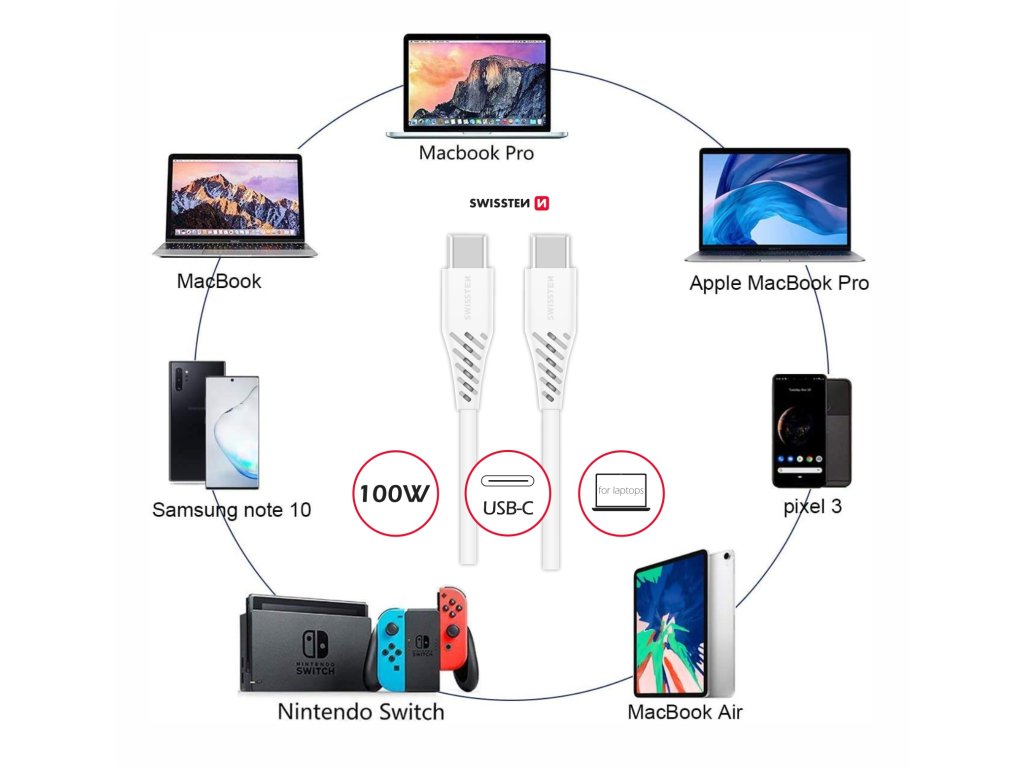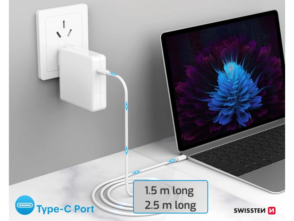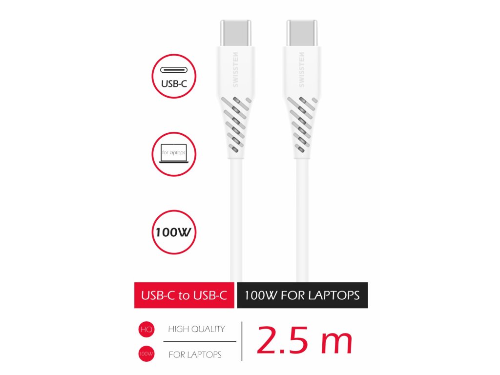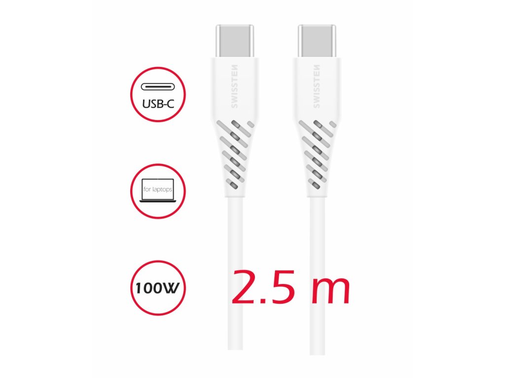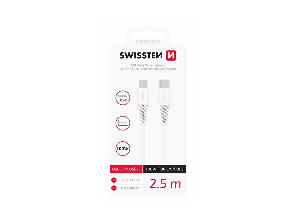 TPU datový kabel USB-C/USB-C s délkou 2,5m umožní dobíjet výkonem 100W a je určený pro rychlé nabíjení laptopů. Baleno v blistru SWISSTEN
