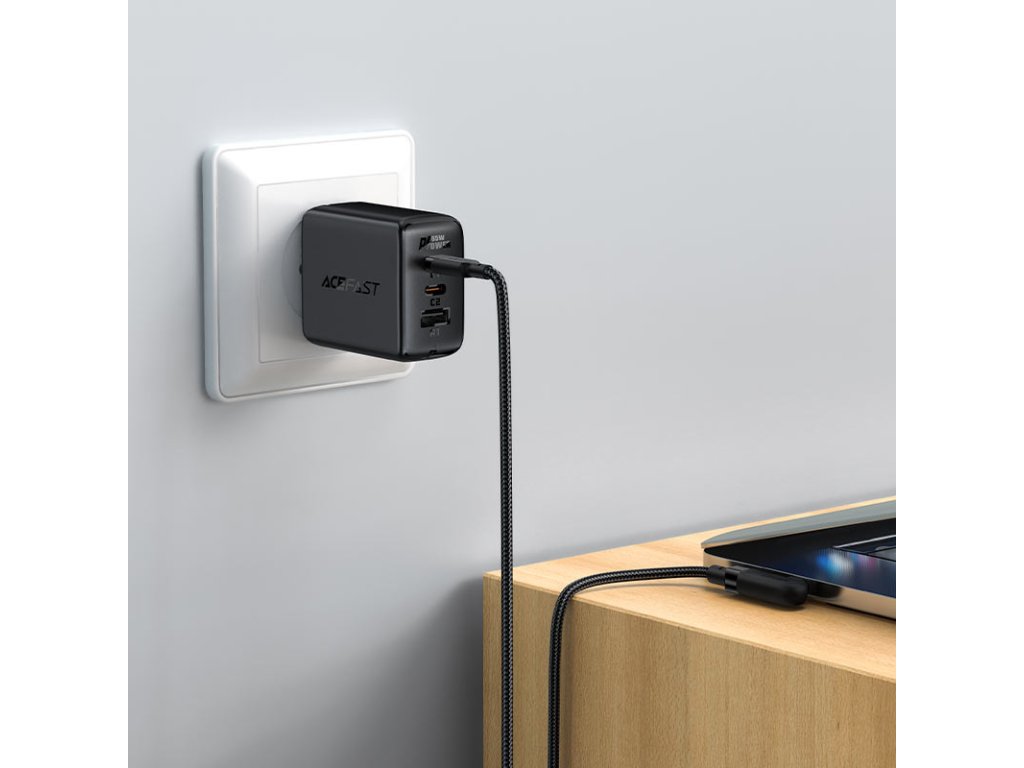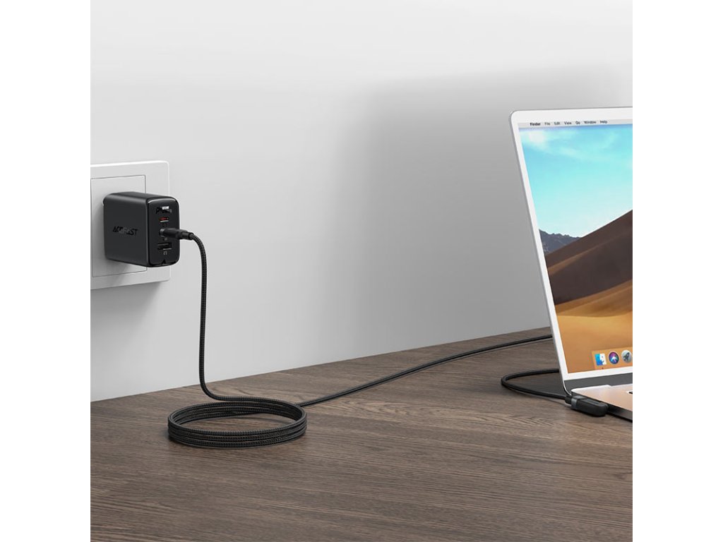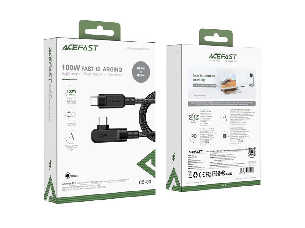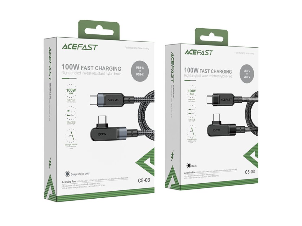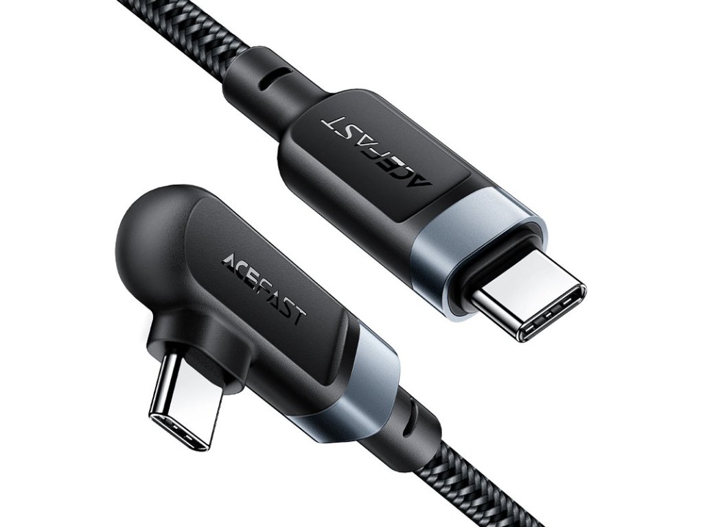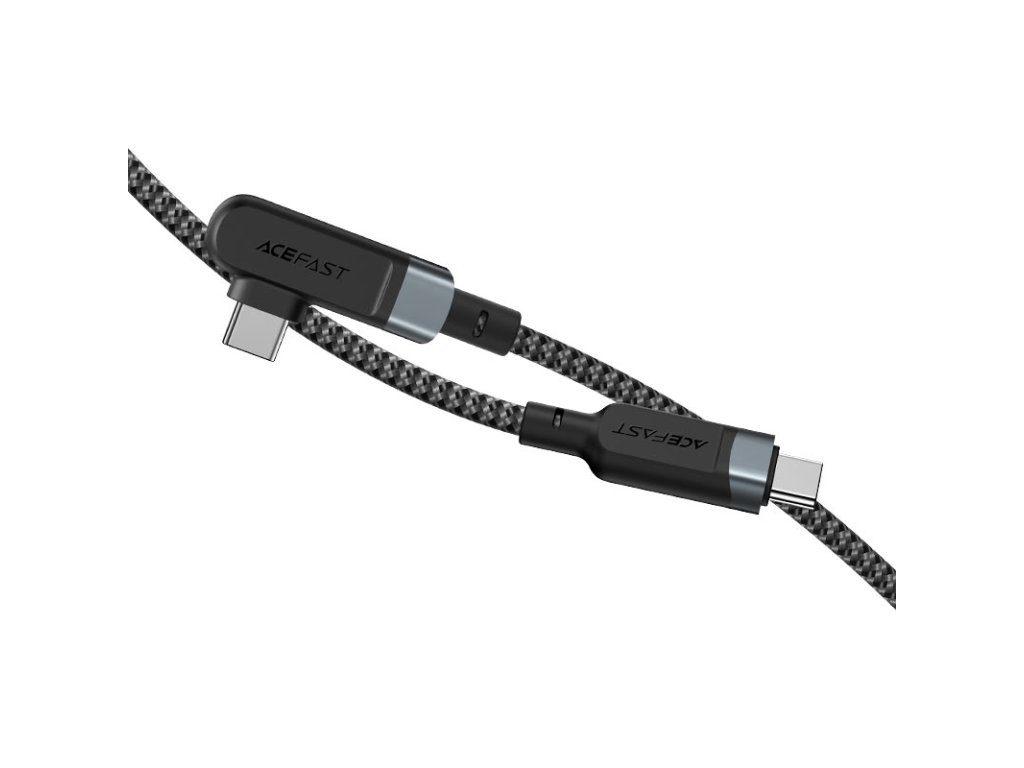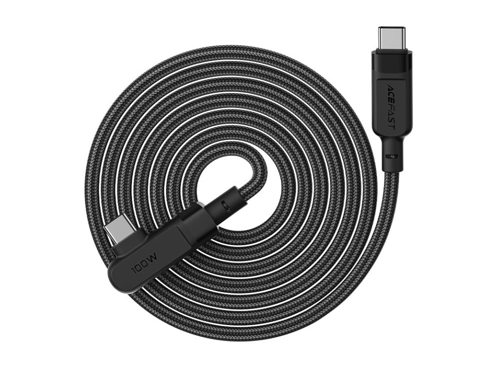 Úhlový USB Type C - USB Type C kabel pro nabíjení a přenos dat od Acefast. Jedna ze zástrček je nastavena pod úhlem 90 stupňů, tato konstrukce usnadňuje používání telefonu, když je připojen k nabíječce. Perfektní řešení pro hráče. Je určen pro zařízení s konektorem USB typu C. Je dlouhý 200 cm a dokáže pracovat s proudem 100W a 5A. Umožňuje rychlé nabíjení v technologii Power Delivery. Lze jej použít k napájení notebooků s konektorem USB typu C, které potřebují až 100W napájení (zkontrolujte specifikaci vašeho notebooku). Kabel je po celé délce opleten nylonem. Zátky mají hliníkové pouzdro. Konce kabelů jsou chráněny proti poškození v místech nejčastějšího ohybu.