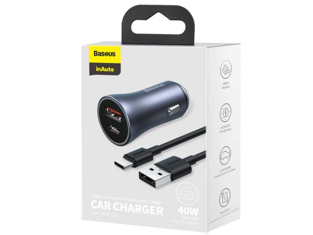 Baseus Golden Contactor Dual USB nabíječka do auta s USB a USB-C výstupem a vysokým výkonem 40W Designové provedení a podpora nabíjecího napětí 5V, 9V, 12V Precizní provedení a kvalitní použité materiály ji předurčují jako perfektní stylový doplněk každého vozu. Navíc podpora nabíjení až 40W pro opravdu rychlé nabití vašeho telefonu nebo tabletu. Specifikace - Model No.: CCJDZ-C - Materiál: Aluminium+ABS+PC - Pro vozy s 12-24V soustavou Výstupy - USB 5V/3A 9V/2A 10V/2A 12V/1.5A 20W Max - USB-C 5V/3A 9V/2.22A 12V/1.6A 15V/1.3A 20V/1A 20W Max - Celkový výstup 20W+20W (Max. 40W) - Rozměry 55mm x 26.5mmDoplňkové parametry