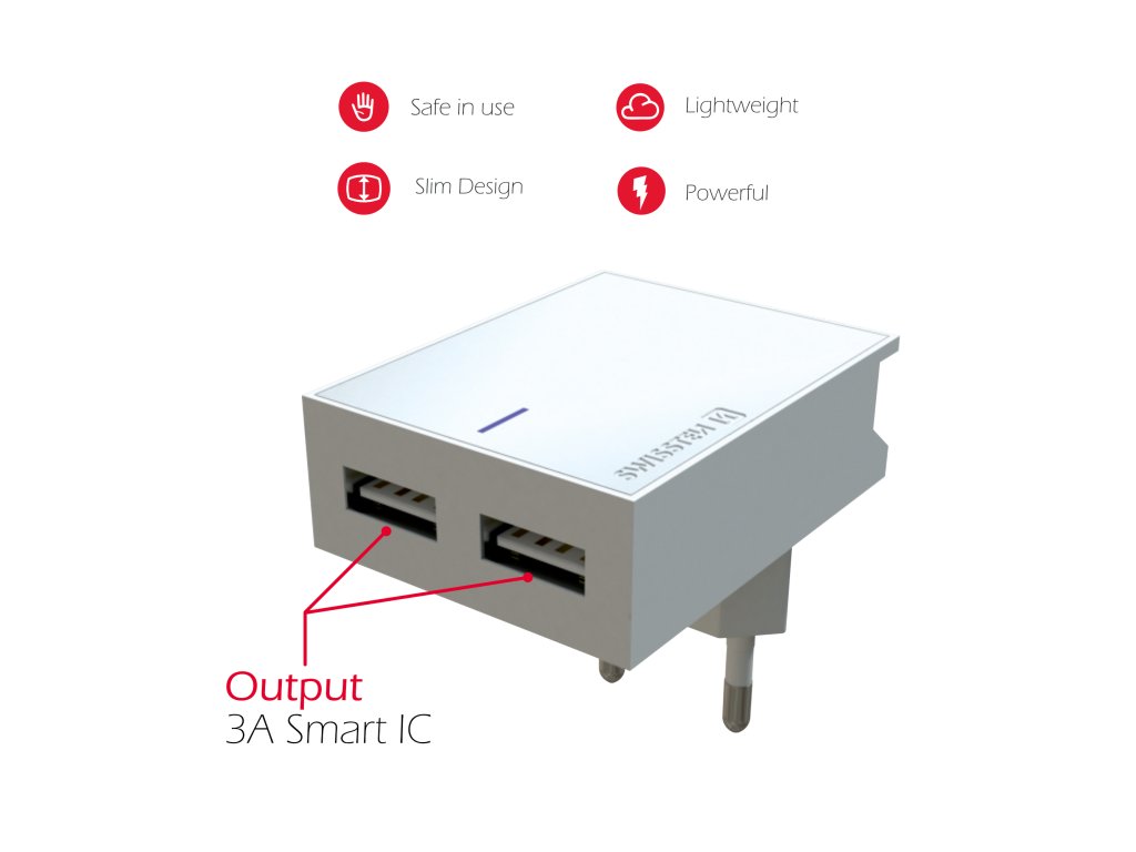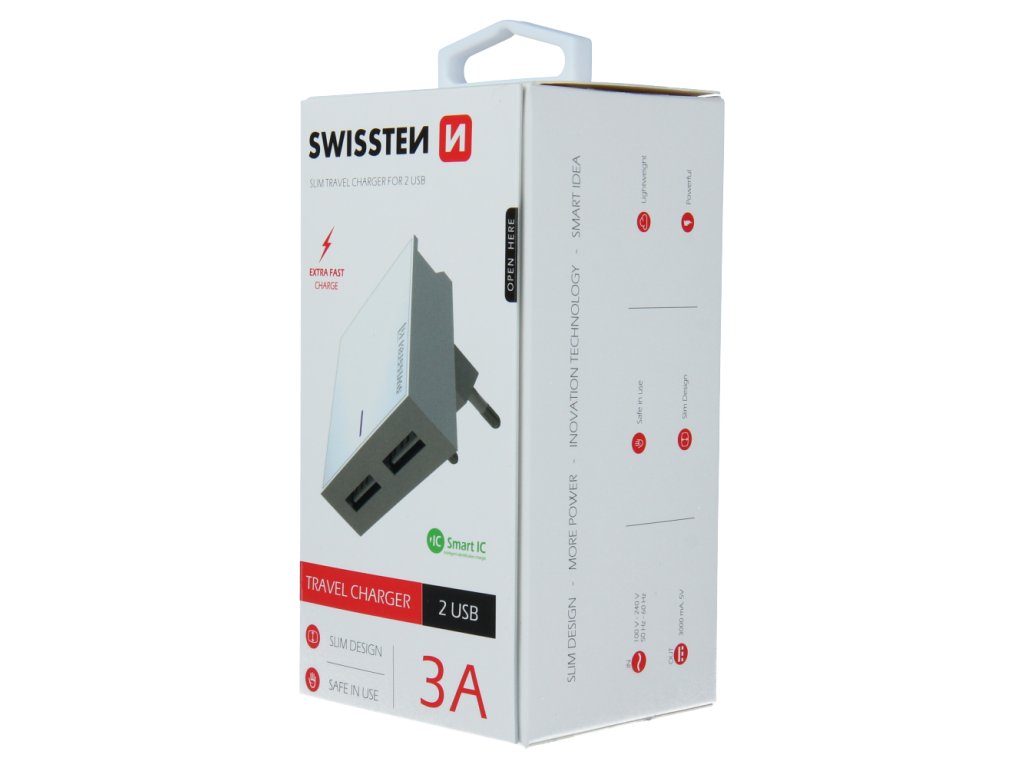 Jedinečná SLIM nabíječka s výstupním proudem 3A, technologií Smart IC, stojánkem pro umístění smartphonu, dvěma USB porty. Lze využít za nábytek, do zásuvky ve volném prostoru nebo kdekoliv jako držák smartphonu. Baleno v blistru SWISSTEN