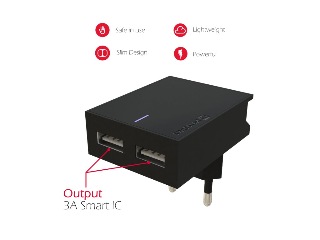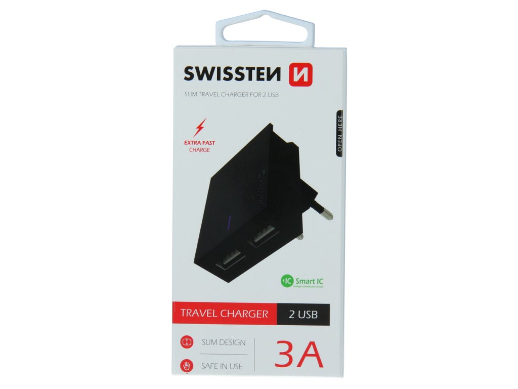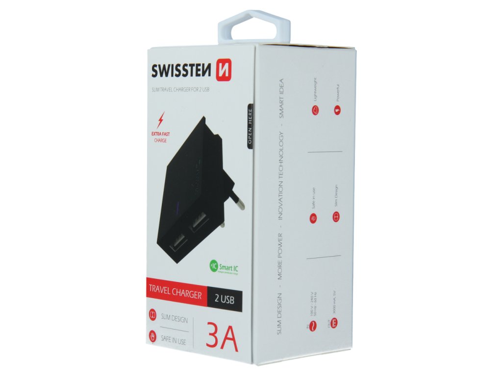 Jedinečná SLIM nabíječka s výstupním proudem 3A, technologií Smart IC, stojánkem pro umístění smartphonu, dvěma USB porty. Lze využít za nábytek, do zásuvky ve volném prostoru nebo kdekoliv jako držák smartphonu. Baleno v blistru SWISSTEN