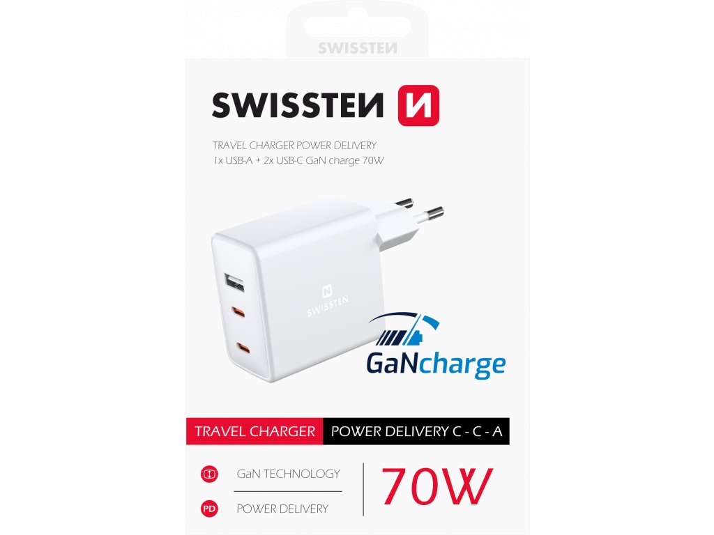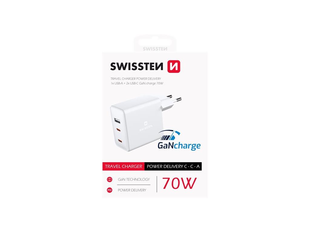 Nabíječka z nové řady nabíječek SWISSTEN s revoluční technologií GaN. Nabíječka je vybavena dvěma výstupy USB-C s technologií rychlého nabíjení Power Delivery a jedním výstupem USB 5W s celkovým výkonem 70W. Baleno v blistru SWISSTEN