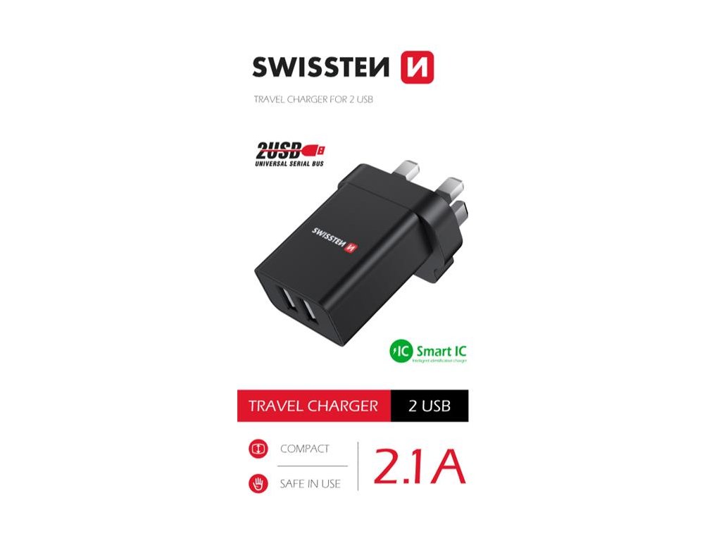 Kvalitní nabíječka s výstupním proudem 2,1A , technologií Smart IC, dvěma výstupy USB a vidličkou pro UK zásuvky. Baleno v blistru SWISSTEN.