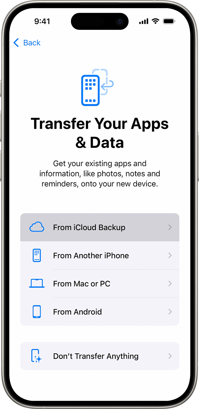 - Na obrazovce „Aplikace a data“ vyberte Obnovit z iCloudu zálohy.