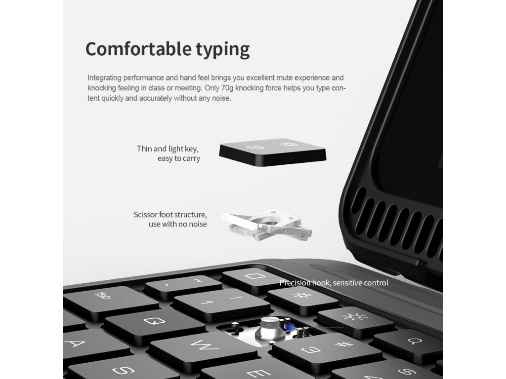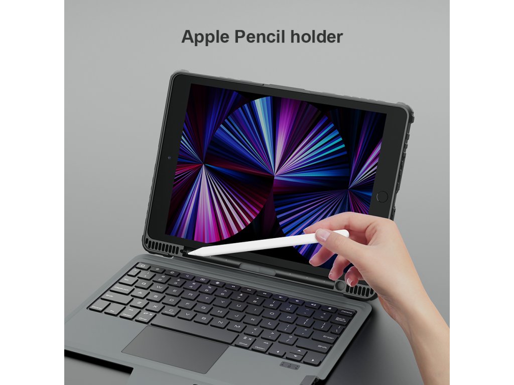 Nillkin Bumper Combo Keyboard Case je víceúčelový ochranný kryt tabletu s klávesnicí, slotem pro Apple Pencil s automatickým nabíjením a plynule nastavitelným úhlem tabletu. Chcete svůj tablet využívat jako mobilní kancelář, nebo jako náhradu za těžký notebook, nebo Vás prostě jen tablet baví, tak přesně pro Vás je zde ochranný kryt Nillkin Bumper Combo. Kryt Vám nabídne špičkově zpracovanou bezdrátovou klávesnici s nízkým zdvihem, tichými a odolnými spínači a precizní profilací kláves pro to nejpohodlnější psaní. Kryt má integrovaný slot s nabíjením přímo pro Apple Pencil. Můžete ho tak mít vždy s sebou a co je hlavní, bude vždy plně nabitý. O nabíjení právě Apple Pencil a napájení bezdrátové klávesnice se stará vysokokapacitní baterie, kterou v případě potřeby dobijete na 100% za pouhé dvě a půl hodiny. Poskytuje provoz pro klávesnici až na dobu 55 dní. Ani zadní strana tabletu ale není nudná. Nejen že nabízí praktickou opěrku pro tablet s plynulým nastavením úhlu, ale také zde najdete posuvný kryt fotoaparátu. Tablet právě díky tomuto patentovanému posuvnému krytu nemůže už být více ochráněn. A to stále není vše, tablet lze opřít jak klasicky na šířku, tak i na výšku. Ať už pro práci s grafikou, psaní textů nebo čtení knih, vybere si prostě každý. Vlastnosti - ochranný kryt s vestavěnou klávesnicí - přihrádka pro Apple Pencil s nabíjením - baterie pro provoz až na 55 dní - plynulé nastavení úhlu tabletu - posuvný ochranný kryt fotoaparátu - možnost opření tabletu na výšku i šířkuDoplňkové parametry