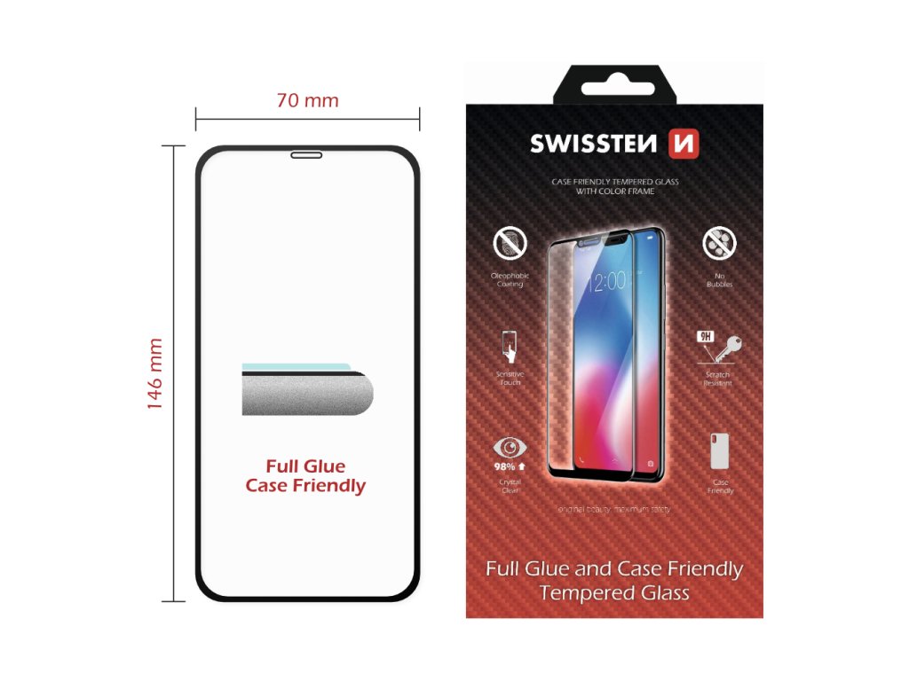 Ochranné sklo CASE FRIENDLY je navrženo tak, aby se dalo použít v kombinaci s jakýmkoliv pouzdrem a zároveň maximálně chránilo smartphon až do krajů displeje. Sklo má oleofobní vrstvu, která zabraňuje ulpívání otisku prstů a tvrdost 9h. Je lepené na displej po celé ploše.Baleno v blistru SWISSTEN