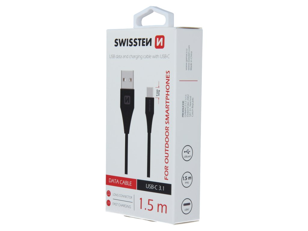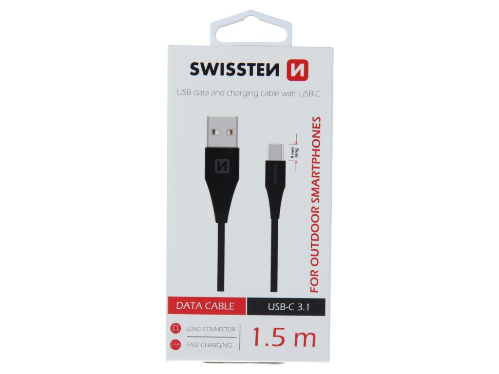 Datový kabel Swissten USB / USB-C 3.1 o délce 1,5 m. Delší konektor je určen pro outdoorové smartphony nebo pro dobíjení při použití objedmného pouzdra. Baleno v blistru Swissten.
