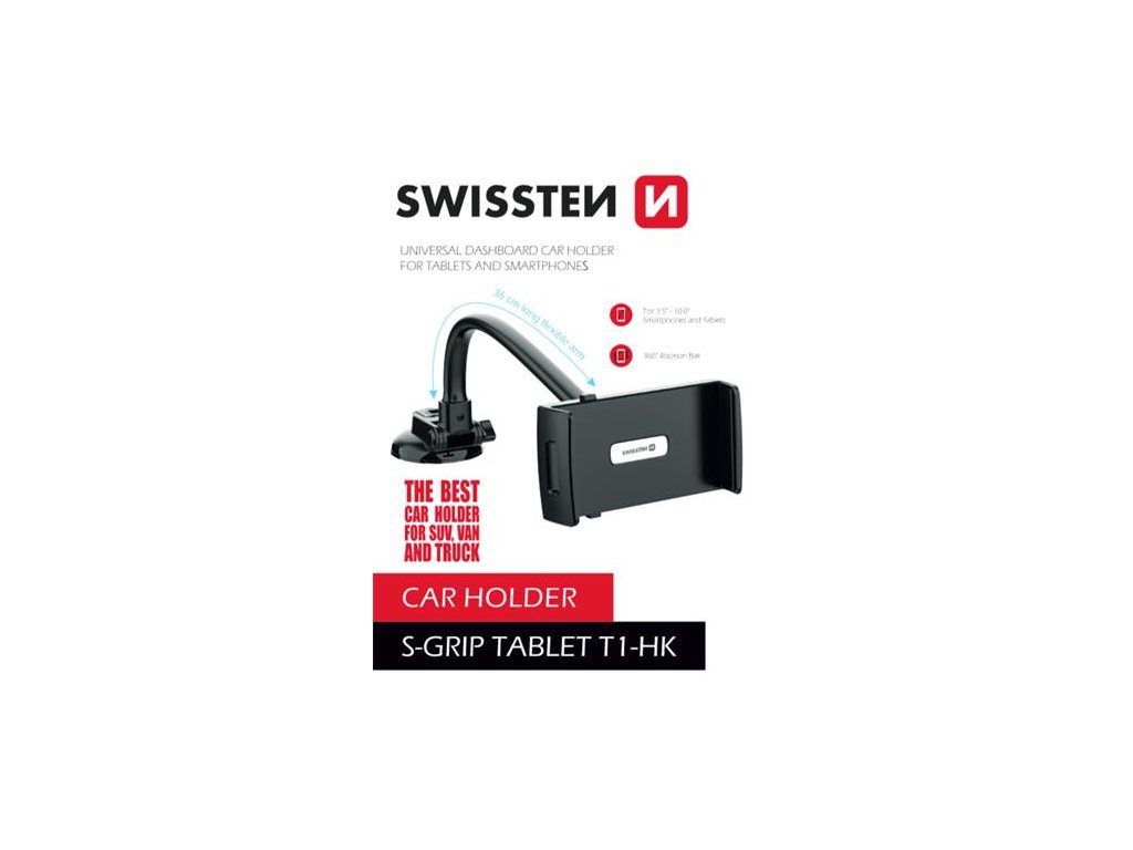 Držák do auta na tablet SWISSTEN S-GRIP T1-HK je určen pro instalaci na čelní sklo či palubovku. Čelisti držáku mají rozpětí až 165mm. Disponuje husím krkem o délce 36cm. Baleno v blistru Swissten.