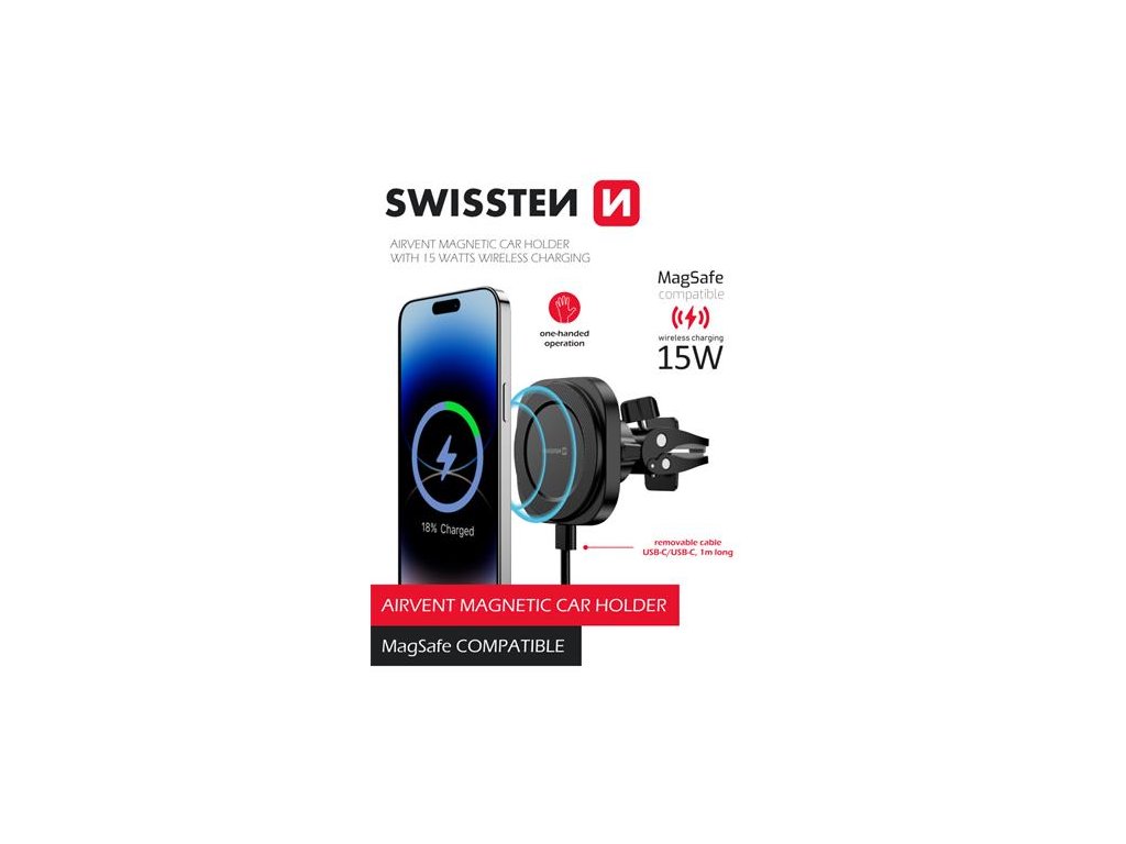 Magnetický držák Swissten do větrací mřížky s bezdrátovým dobíjením kompatibilním s MagSafe, vysokým výkonem 15W a odpojitelným kabelem. Baleno v blistru SWISSTEN.