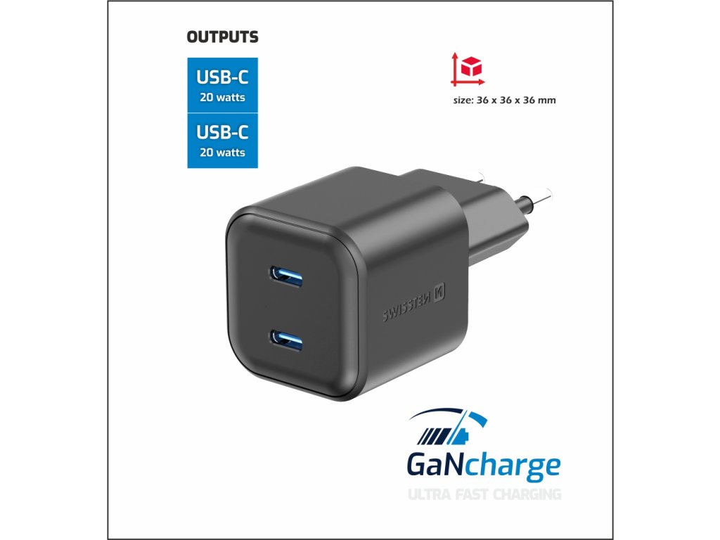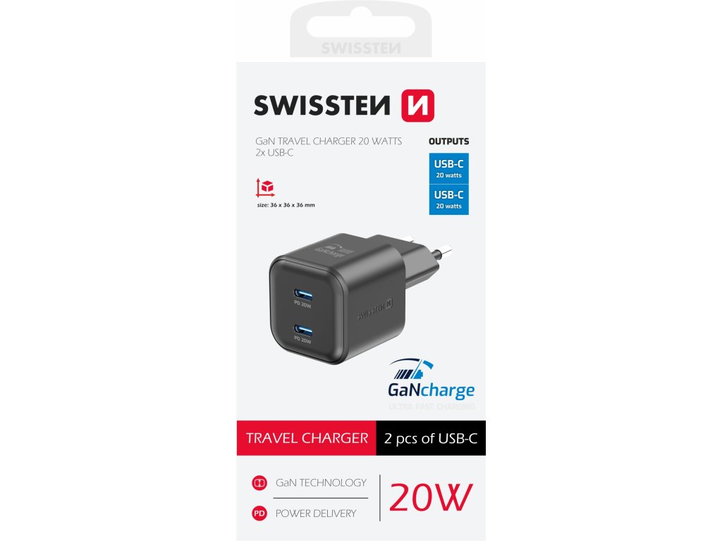 SWISSTEN SÍŤOVÝ ADAPTÉR GaN 2x USB-C 20W POWER DELIVERY ČERNÝ