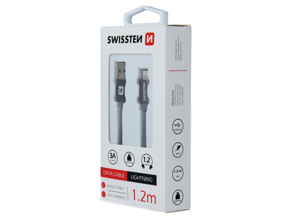 Datový kabel Swissten USB/Lightning s kvalitním textilním opletením a kovovými kryty konektorů. Díky délce 1,2m je vhodný do auta, na stůl v kanceláři nebo na noční stolek. Kabel je zesílený a přenese tak větší proud (až 3A) a zvládne i rychlý přenos dat 480 Mb/s. Životnost kabelu v ohybu je více než 10000 ohybů. Kovový kryt konektoru je odolnější proti mechanickému poškození než běžné plastové kryty konektorů. Technické parametry: Tloušťka kabelu - dva pocínované měděné vodiče, kde každý 22 AWG 70/0,01 (to znamená, že každý vodič má 70 pramenů tenkých 0,01 mm, (např originální kabel Apple MD818 má 37 pramenů o tloušce 0,08 mm) + vnější plášť TPE (měkký plast) - dva pocínované měděné datové prameny, kde každý 28 AWG-12 + vnější plášť TPE (měkký plast) Kryt konektoru - materiál: eloxovaný hliník Eloxování neboli anodizace je druh chemicko-tepelné povrchové úpravy výrobků z hliníku (zkratka ELektrolytická OXidace hliníku). Spočívá ve vytvoření ochranné vrstvy oxidu hliníku na upravovaném povrchu. Tato vrstva již dále neoxiduje, a tím před oxidací chrání i samotný hliník. Používá se například v letecké (i automobilové) výrobě ale nejčastěji v případech, kde je hliník použit v exteriéru, např. u hliníkových oken atd. Výhodou je, že po vytvoření tenoučké vrstvy je materiál chráněn proti povětrnostním vlivům.Dodatočné parametre