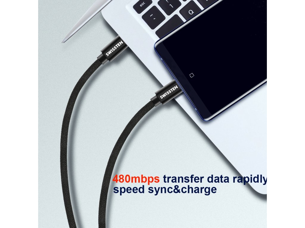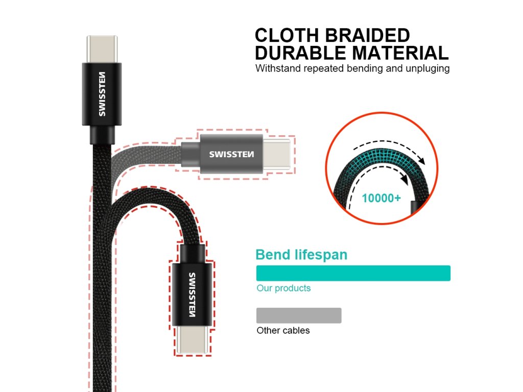 Datový kabel Swissten USB-C/USB-C s kvalitním textilním opletením a kovovými kryty konektorů. Díky délce 2,0m je vhodný do nákladních aut, do aut pro rodiny, nebo v případě že chcete nabíjet a zároveň smartphon používat. Kabel je zesílený a přenese tak větší proud (až 3A) a zvládne i rychlý přenos dat 480 Mb/s. Životnost kabelu v ohybu je více než 10000 ohybů. Kovový kryt konektoru je odolnější proti mechanickému poškození než běžné plastové kryty konektorů. Baleno v blistru SWISSTEN.