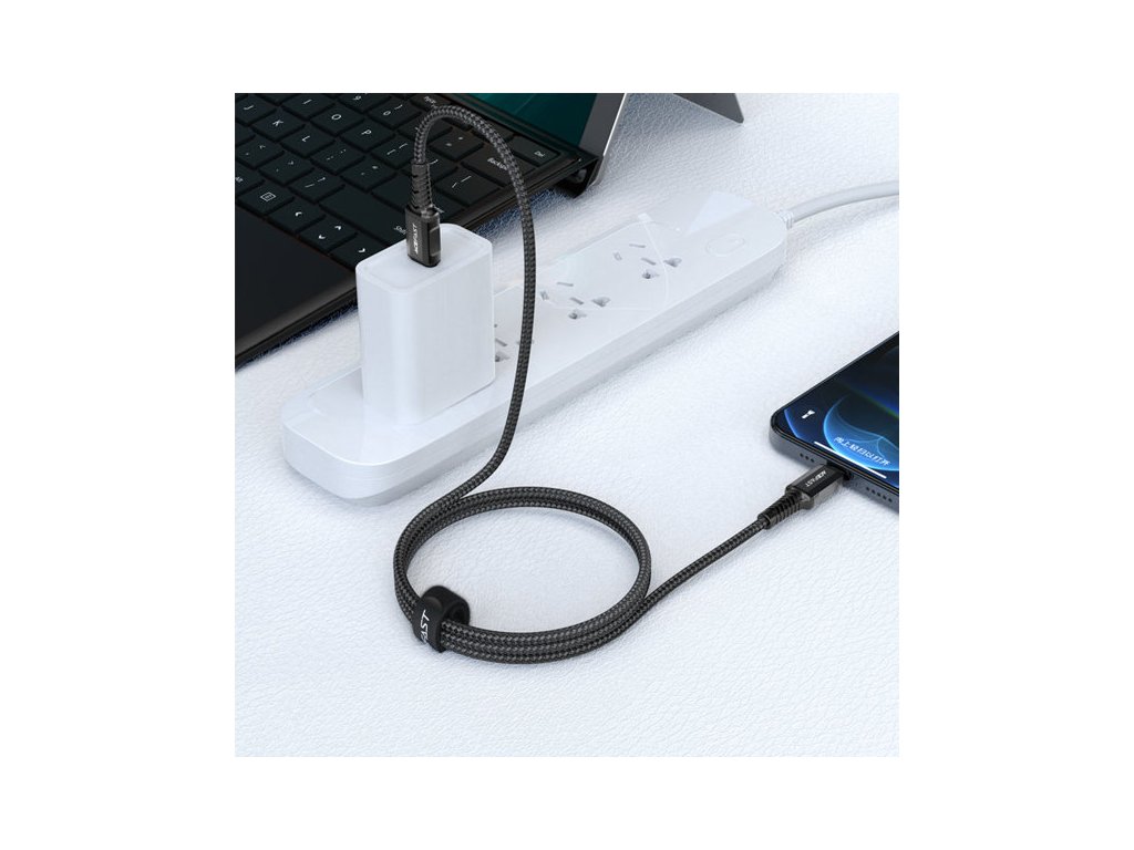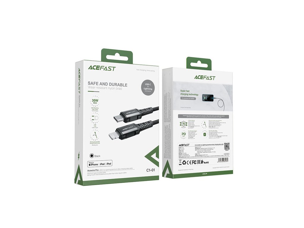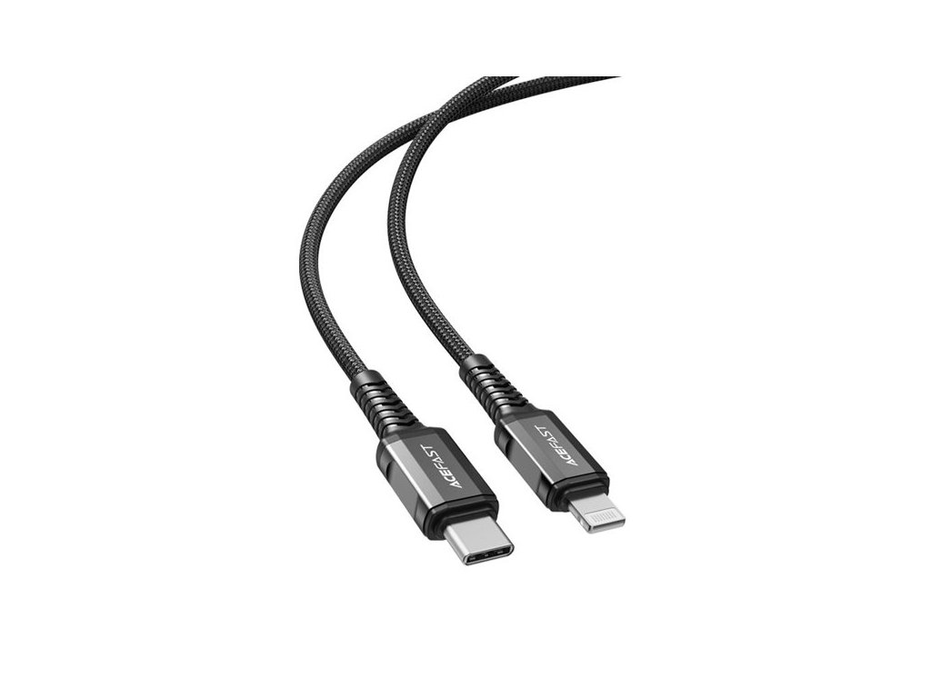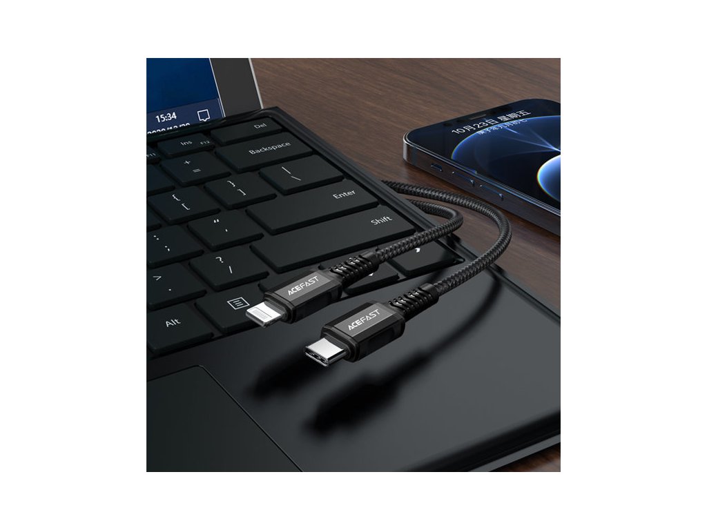 Acefast USB Type C - Lightning kabel pro nabíjení a přenos dat. Je určen pro zařízení Apple s konektorem Lightning. Je dlouhý 180 cm a je uzpůsoben pro práci s proudem 30W a 3A. Je kompatibilní s rychlonabíjením Power Delivery. Má certifikát MFI (Maide For iPhone), takže telefon nezobrazí zprávu o neoriginálním příslušenství. Kabel je po celé délce opleten nylonem. Zátky mají hliníkové pouzdro. Konce kabelů jsou chráněny proti poškození v místech nejčastějšího ohybu.