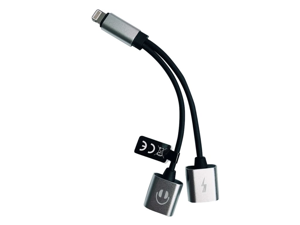 Adaptér se vstupním Lightning audio konektorem a nabíjecím Lightning konektorem, pomocí něhož můžete nabíjet iPhone a současně poslouchat oblíbenou hudbu.