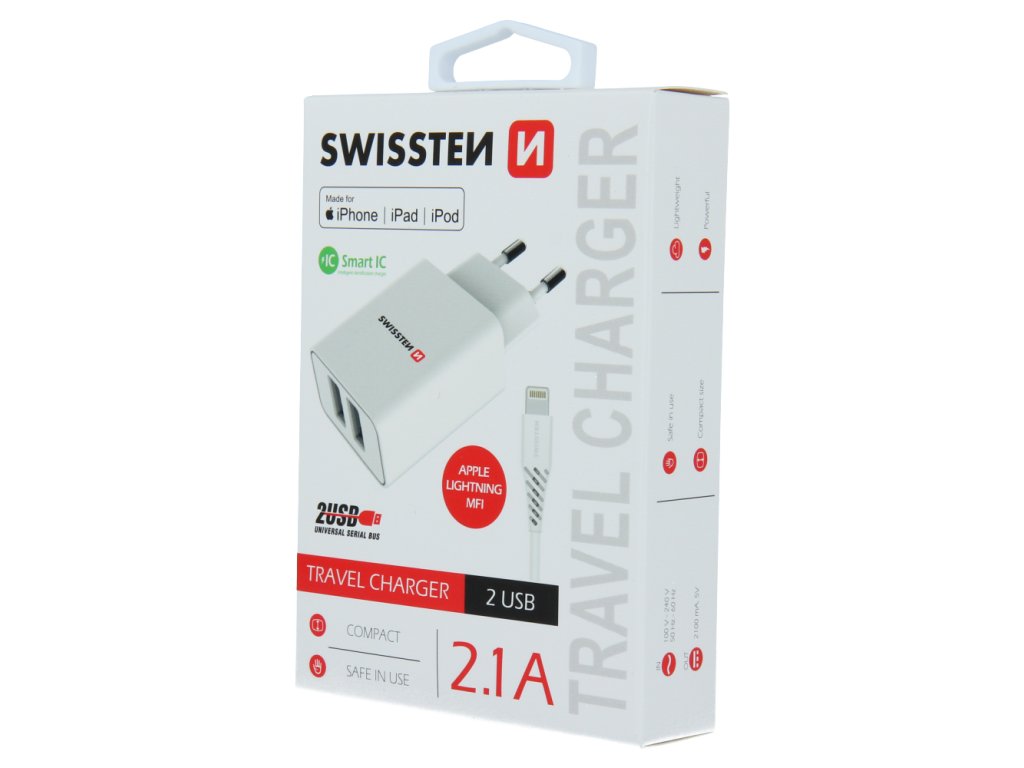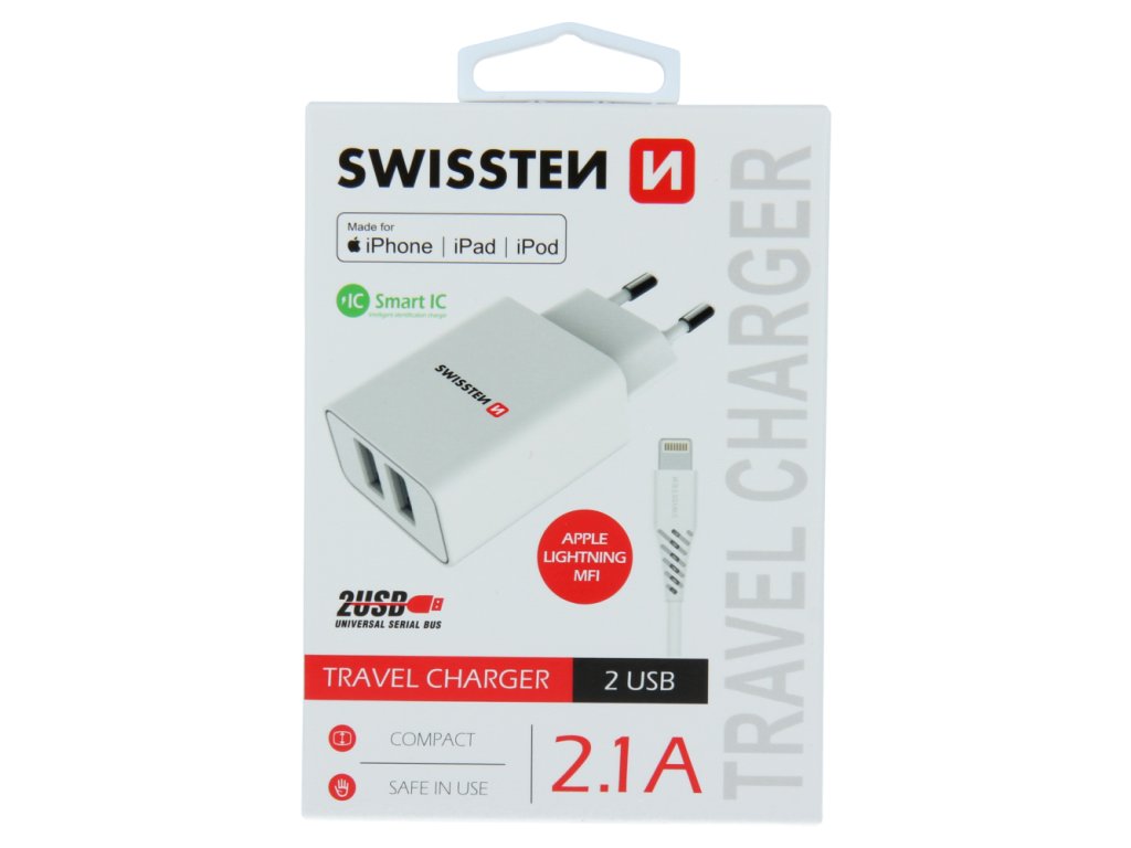 Kvalitní nabíječka s výstupním proudem 2,1A , technologií Smart IC a dvěma výstupy USB. V balení 1,2 m dlouhý kabel lightning MFi. Baleno v blistru SWISSTEN.