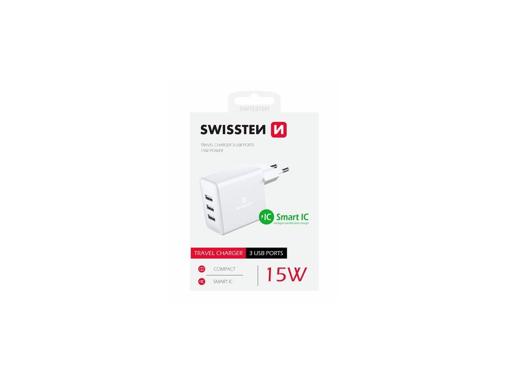 Velice praktický adaptér SWISSTEN se třemi výstupy USB a celkovým výstupem 15W a technologií STMART IC. Baleno v blistru SWISSTEN