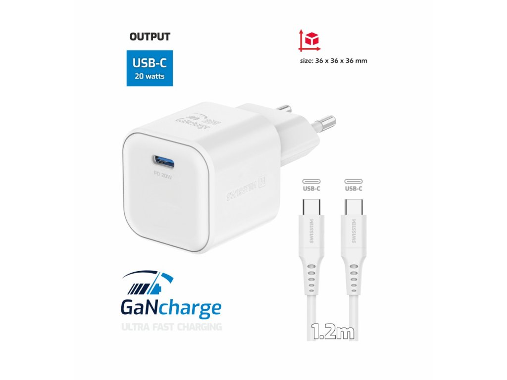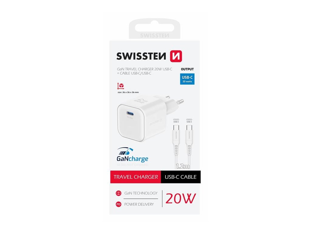SWISSTEN SÍŤOVÝ ADAPTÉR GaN 1x USB-C 20W POWER DELIVERY BÍLÝ + DATOVÝ KABEL USB-C/USB-C 1,2 M BÍLÝ