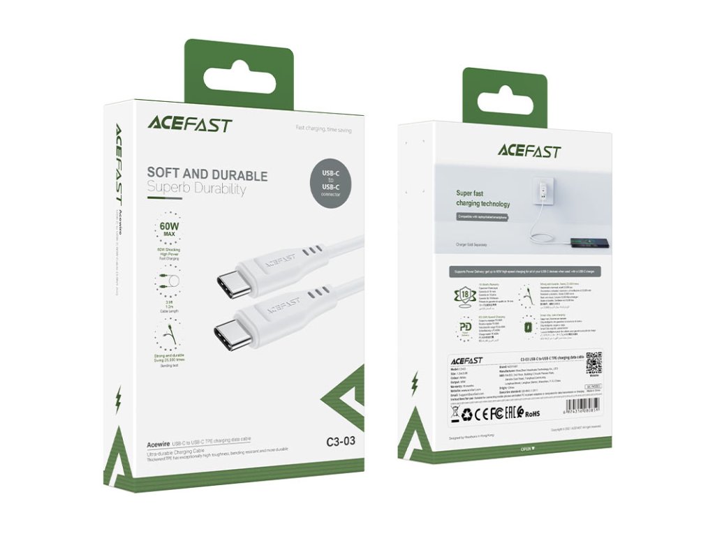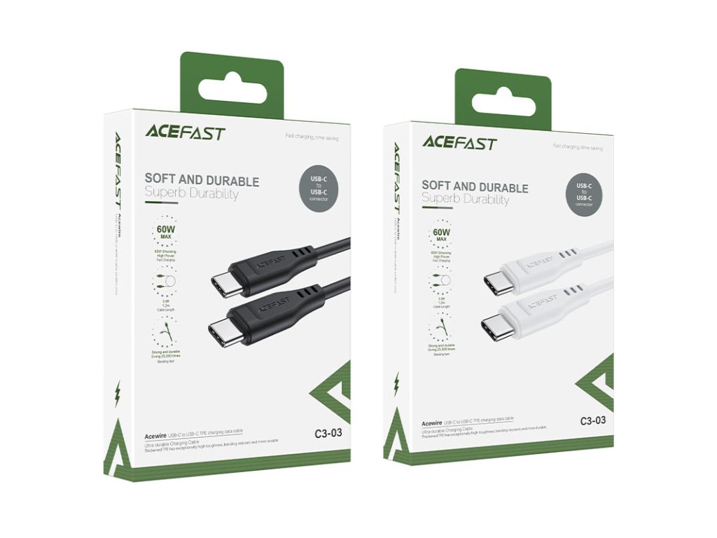 Kabel USB typu C - USB typu C pro nabíjení a přenos dat od společnosti Acefast. Je určen pro zařízení s konektorem USB typu C. Je dlouhý 120 cm a dokáže pracovat s proudem 60W a 3A. Umožňuje rychlé nabíjení v technologii Power Delivery. Lze jej použít k napájení notebooků s konektorem USB typu C, které potřebují až 60W napájení (zkontrolujte specifikaci vašeho notebooku).