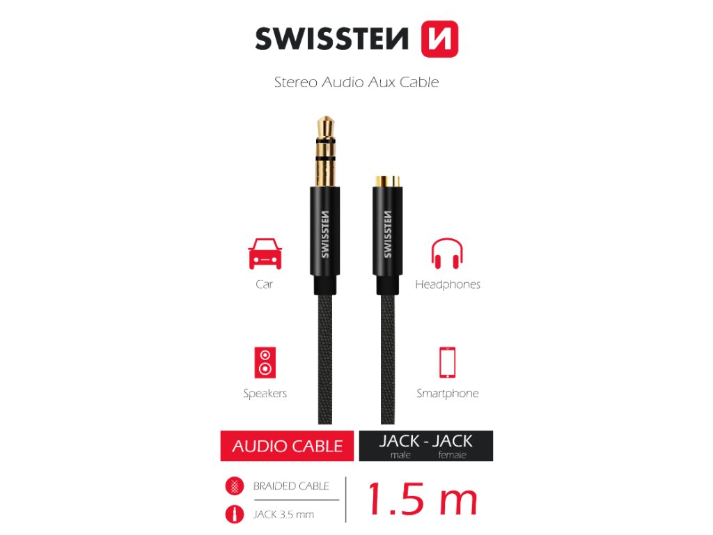 Stereo audio propojovací kabel AUX s délkou 1,5m a konektory JACK 3,5mm samec/samice. Baleno v blistru SWISSTEN