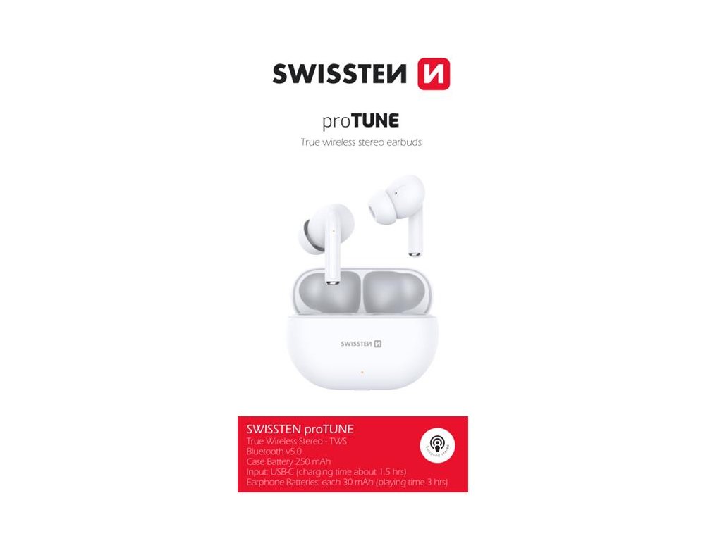 Bluetooth sluchátka SWISSTEN PRO TUNE mají čistý zvuk, měkké silikonové špunty do uší a váží pouhých 2x3,2g. Baleno v blistru SWISSTEN.