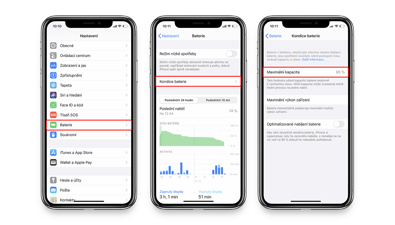 S vydáním iOS 11.3 v roce 2018 společnost Apple představila novou funkci, která Vám dokáže říct spoustu o kapacitě a funkci baterie = Stav baterie. Doslovně popíše, jak dlouho by měl váš iPhone vydržet mezi nabíjecími cykly na stupnici od 0 % do 100 %. Zároveň Vám i díky chytré funkci dokáže přesně říci jakou aplikací se Vám telefon nejvíce vybíjí a také dokáže při nabíjení udržet baterii do 80% a nabít do 100% až chvíli před Vašim budíkem.